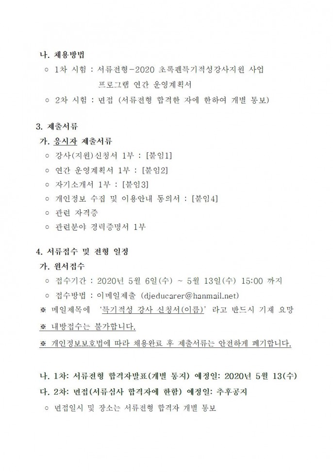 2020년 초록펜특기적성강사지원 사업 강사…