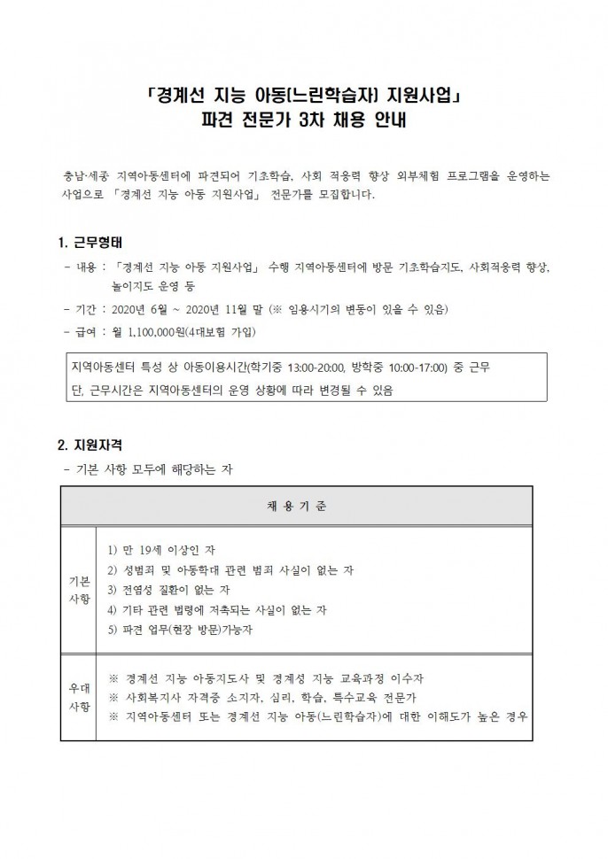 [충남] 경계선 지능 아동(느린학습자) 지원사업 파견 전문가 3차 채용 안내
