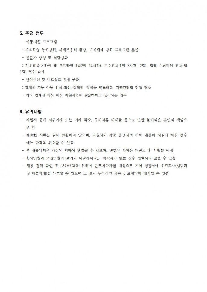 관저지역아동센터 토요종사자 채용 공고