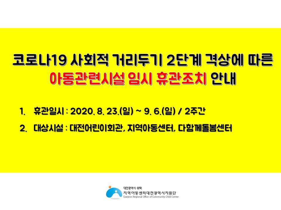코로나19 사회적 거리두기 2단계 격상에 따른 아동관련시설 임시 휴관조치 안내