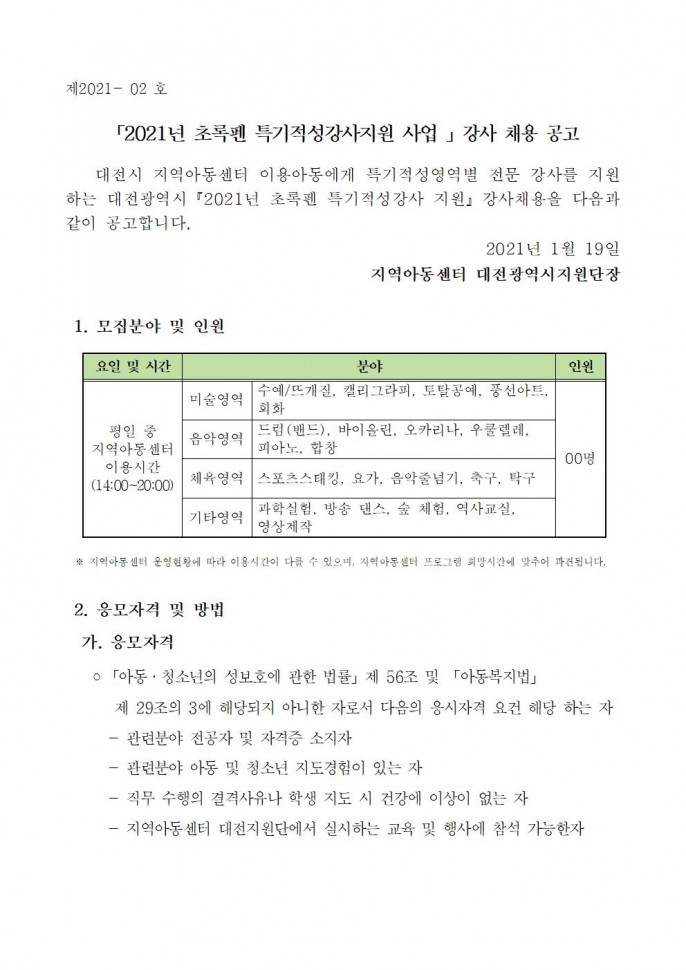 (지역아동센터) 2020 초록펜특기적성강사지원…