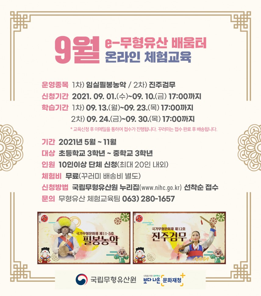 (사)전통문화마을에서 진행하는 '9월 e무형유산 배움터'를 아래와 같이 안내드리오니,