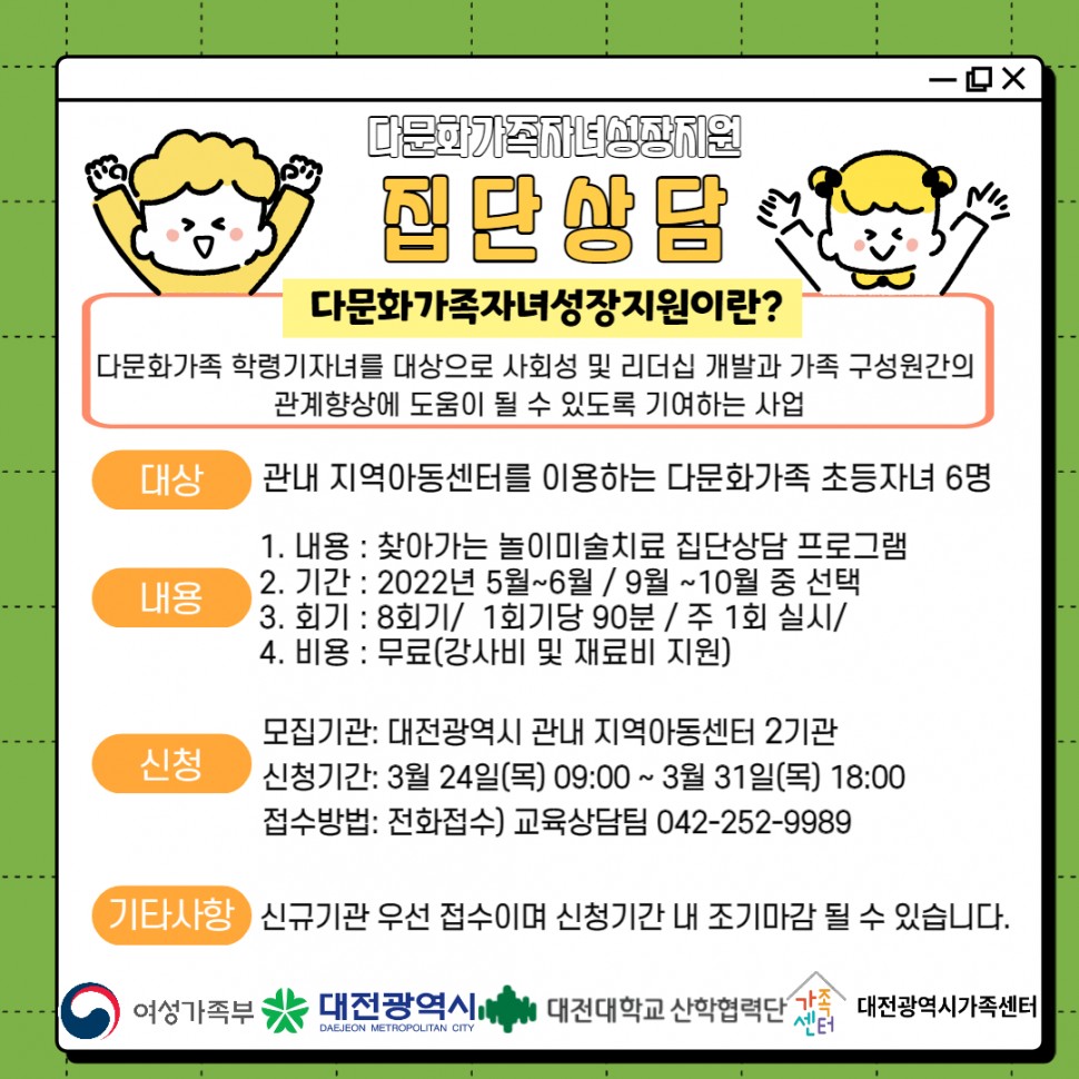 대전광역시가족센터에서 주관하는 [다문화가족자녀성장지원 집단상담 프로그램] 신청을