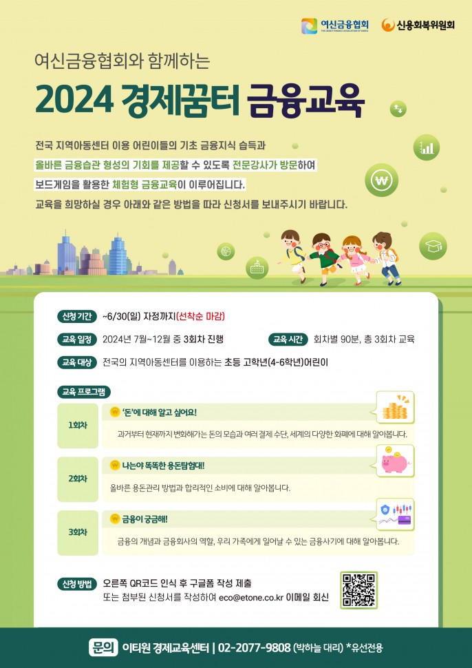 여신금융협회와 신용회복위원회에서 진행하는 '경제꿈터' 금융교육을 아래와 같이 안내하오니 많은 신청 바랍니다.