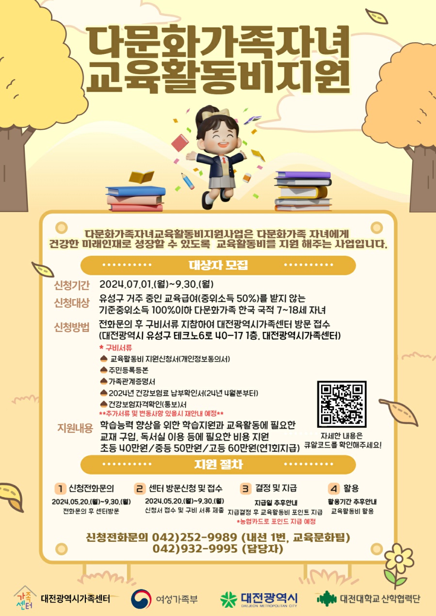 대전광역시가족센터에서 진행하는 2024년 다문화가족 자녀 교육활동비 지원사업을 아래와 같이 안내드립니다.