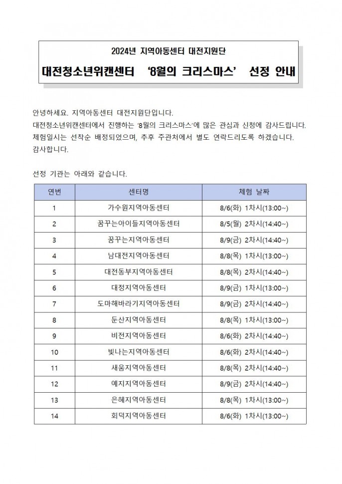 [선정공지] 2024년 대전청소년위캔센터…