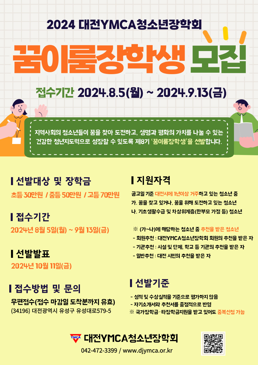 대전YWCA청소년장학회에서 제8기 꿈이룸장학생을 아래와 같이 선발합니다.