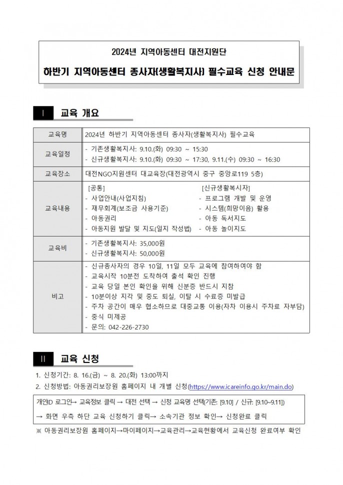 2024년 하반기 지역아동센터 종사자(생활복지사) 필수교육을 아래와 같이 안내하오니 신청바랍니다.