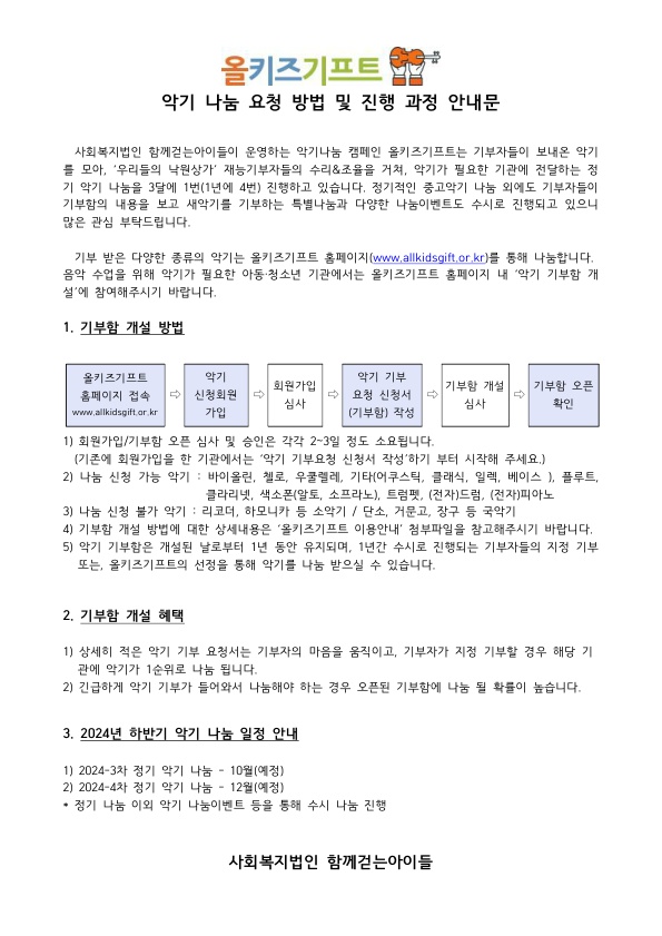 사회복지법인 함께걷는아이들의 2024년 올키즈기프트 악기 나눔 캠페인을 붙임과 같이 안내하오니 관심바랍니다.