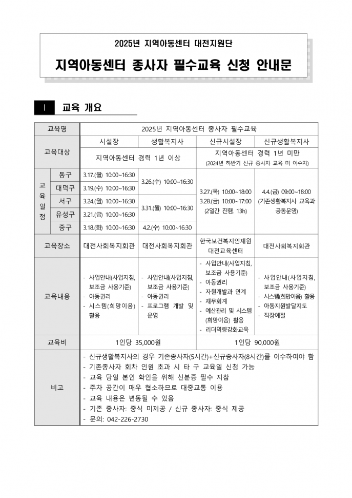 2025년 지역아동센터 종사자 필수교육을 아래와 같이 안내하오니 확인 후 신청 바랍니다.