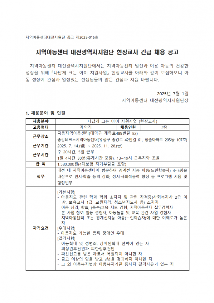 [공지] [채용] 나답게 크는 아이 지원사업 현장교사…
